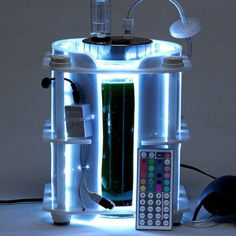 The lab scale photobioreactor offers an optimized design for delivering light to the culture to maximize growth and product accumulation rates. The UTEX Photobioreactors have been refreshed with an upgraded design. We've swapped some of the plastic components of the original photobioreactor with metal ones, making the updated unit longer lasting and reusable! The optional RGB-LED Lighting Platform is customizable (red, blue, and green LED lights) and testable for labs or classrooms wishing to optimize a light source for a particular species of interest. The gas exchange agitator further enhances growth and is likewise customizable and testable.